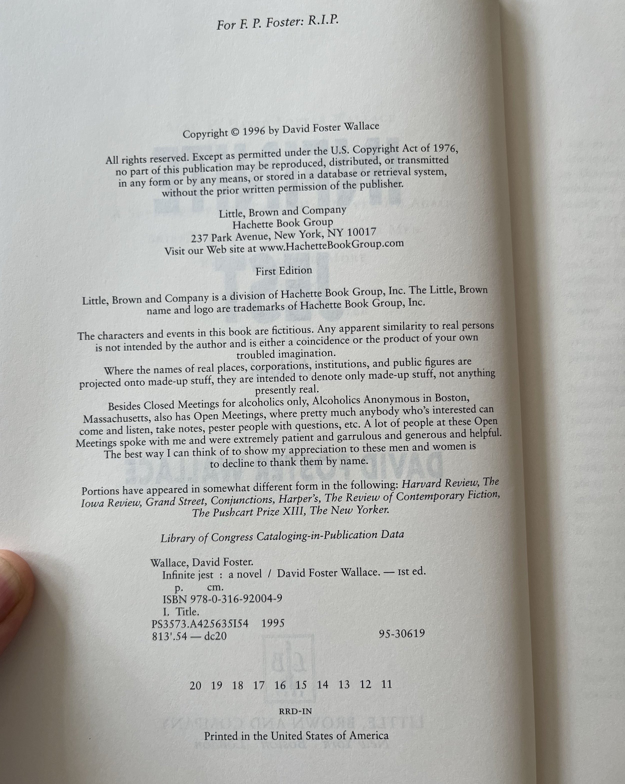 Why is this all such a big deal? Because a reputable book dealer currently lists a copy of the first edition of David Foster Wallace’s Infinite Jest for $1,000. This book dealer includes enough detail for me to believe, together with their reputation, that it is the true first.